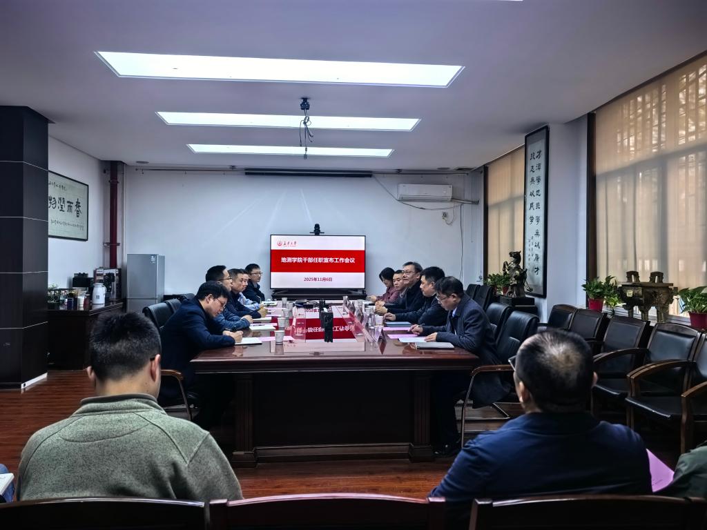 2025年11月6日上午,地测学院干部任职宣布工作会议在南校区东院学院会议室召开。校党委书记陈志坚、副校长李振洪、党委常委、组织部部长石松出席会议。学院领导班子成员、系(中心)主任、科级干部及教师代表参加会议。会议由学院党委书记王树莹主持。会议现场会上,石松部长宣读了关于黄达同志任职的通知。校党委书记陈志坚代表学校党委讲话,他首先对李振洪同志在担任地测学院院长期间为学院发展作出的重要贡献表示衷心感谢,并对新任院长黄达同志给予充分肯定。...