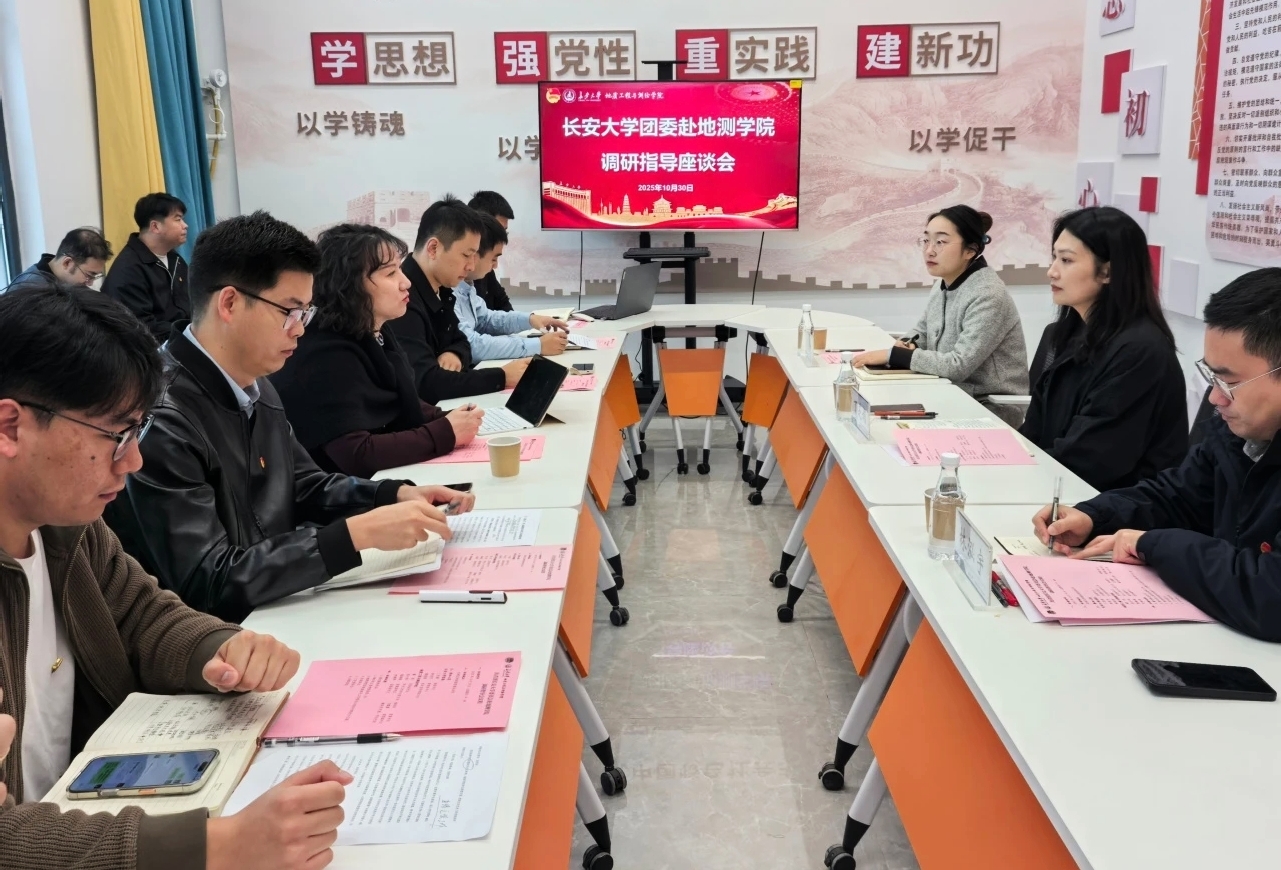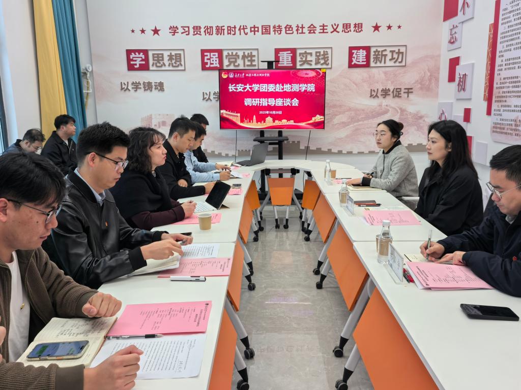 校团委书记丁芝娟,校团委副书记林泓宇,地测学院党委副书记潘迎,校团委组织宣传部副主任琚佳悦,地测学院全体辅导员参加调研。