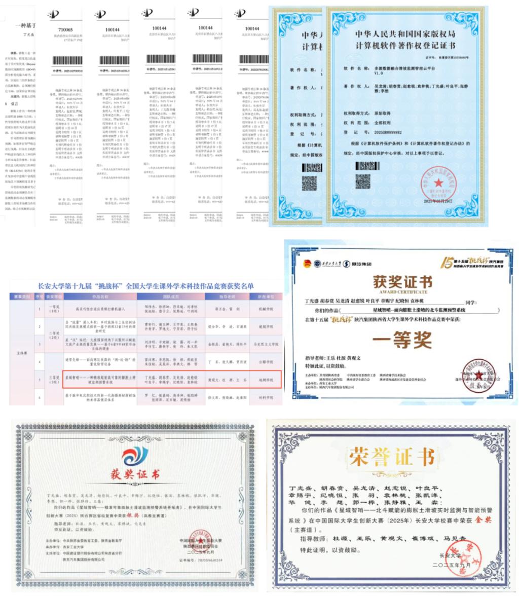 经过600余天攻坚,团队在多源数据融合、智能预警等关键技术上取得进展。围绕地质灾害智能监测预警,团队成功研制出低成本、小型化北斗/GNSS监测设备及预警云平台,相关成果已形成国家发明专利4项、实用新型专利1项、软件著作权2项、EI论文1篇为核心的知识产权体系。团队将研究成果凝练为7万余字技术报告与10万余字创业计划,荣获“挑战杯”课赛主体赛全国三等奖、中国国际大学生创新大赛省级银奖等重要奖项。