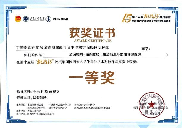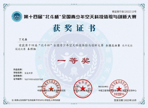 丁光盛,男,中共党员,长安大学测绘工程专业2022级本科生,曾任地测学院大学生科技创新创业协会执行主席。大三学年加权成绩93.32,综合测评位列全院前1%,获国家奖学金等17项奖学金,累计奖励超6万元,已推免至武汉大学攻读硕士学位。申请国家发明专利4项、实用新型专利1项,获软件著作权2项,并有论文投稿于EI期刊。组织或参与“黄河科考”等7项社会实践,获CCTV等媒体报道百余次,连续三年获评校优秀实践团队与个人。担任院科协主席期间策划活动54场,服务师生超2万人次,助力学院在“挑战杯”等赛事中获奖数居首,推动学校连续两年获“北斗杯”省级优秀组织单位。作为队长获2024年全国大学生数学建模竞赛一等奖、第十四届“北斗杯”全国一等奖等各类校级及以上奖项与荣誉称号70余项。