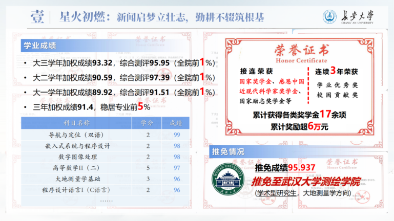 进入长安大学后,他珍惜来之不易的求学机会,借助生源地助学贷款完成学业,也把全部热情投入到学习中。大三学年,他的加权成绩达到93.32,综合测评95.95,位列学院前1%,先后获得国家奖学金、感恩中国近现代科学家奖学金等各类奖学金17项,累计金额6万余元,并成功推免至武汉大学继续深造。