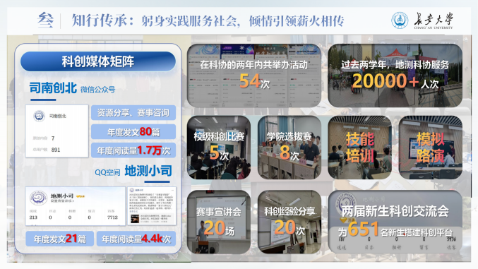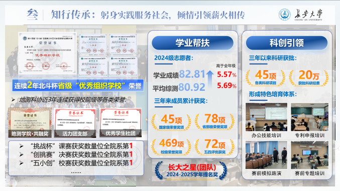 作为地测学院大学生科技创新创业协会执行主席,他始终以“不做青年‘官’,要做青年友”为准则,以服务同学、赋能集体为己任,策划组织科创活动54场,覆盖师生2万余人次,系统推进赛事培训、项目孵化与成果展示,助力学院在“挑战杯”“北斗杯”等重要赛事中屡创佳绩。地测科协获评“长大标兵奖·长大之星(团队)提名奖”、“活力团支部”等荣誉,他本人也荣获“共青团标兵”等多项荣誉称号。