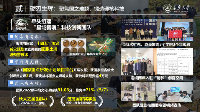 “青年科研的方向,应该与国家需要同频共振。”怀着这样的信念,他将目光投向防灾减灾这一国家重大需求领域,牵头组建“星域智哨”科技创新团队,聚焦膨胀土滑坡监测与预警关键技术,依托国家重点研发计划相关平台持续开展科研攻关。
