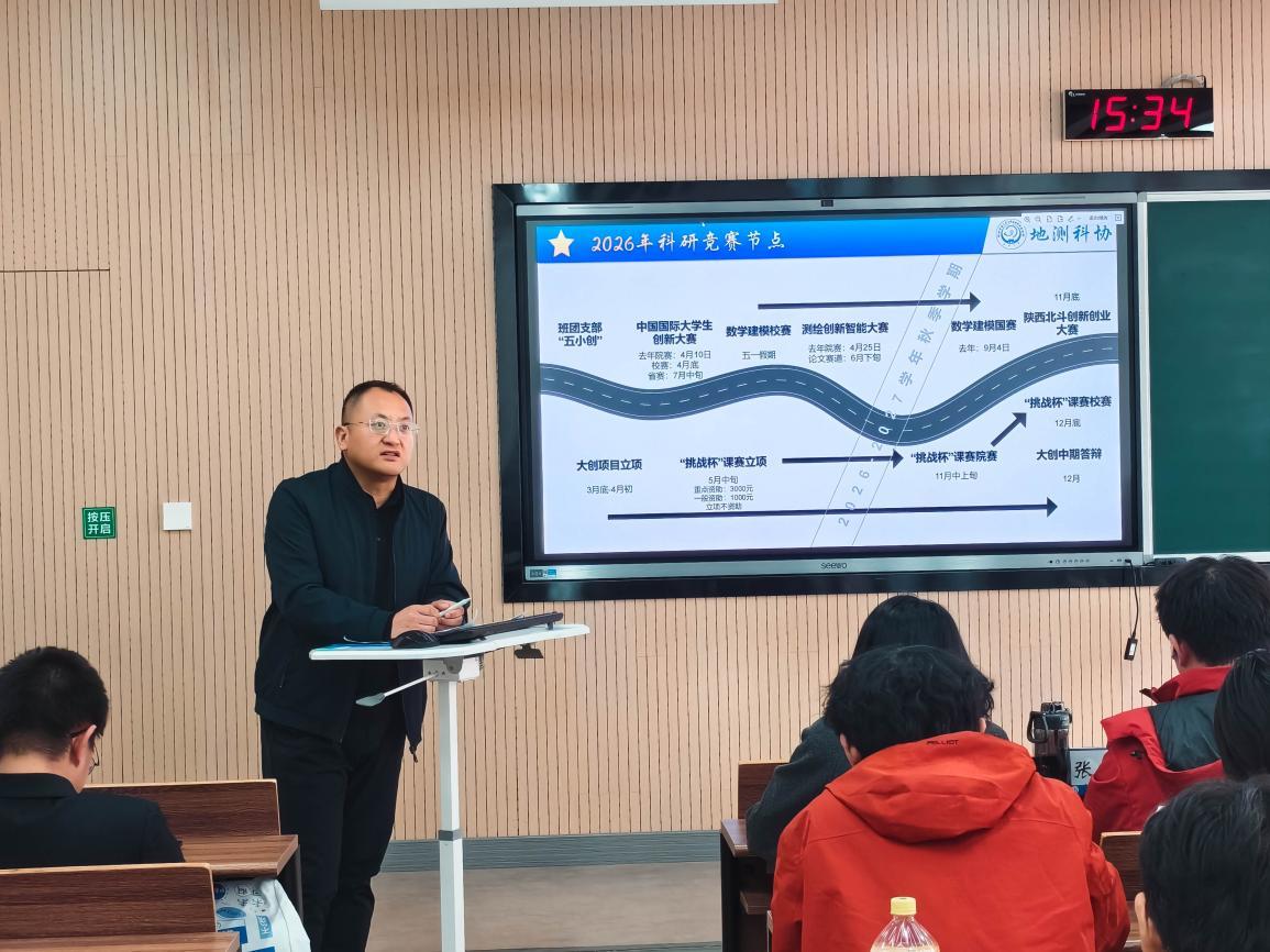 为促进地质工程与测绘学院学院大学生科技创新创业协会(下简称“地测科协”)内部沟通交流,总结过去一学期工作成效并规划未来工作,地测科协于2026年3月22日14时在WX2209教室召开了2025-2026学年春季学期第一次全体例会。地测科协指导老师马见青、地测科协2025-2026学年执行主席张凯洋、主席团成员姜炤君、袁林桃、梁怡晨以及地测科协全体成员共同参会。会议由朱靖远主持。
