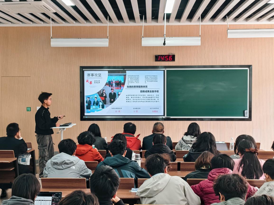 会议伊始,主持人介绍了会议流程并宣布例会正式开始。会议第一环节,由副主席袁林桃发言。她先讲述自己参与竞赛的经历,鼓励同学们要敢于参加竞赛并在其中磨练自己,随后介绍了各竞赛项目的比赛时间与要求,紧接着她介绍了一些了解比赛信息的网站以及与竞赛有关的软件。