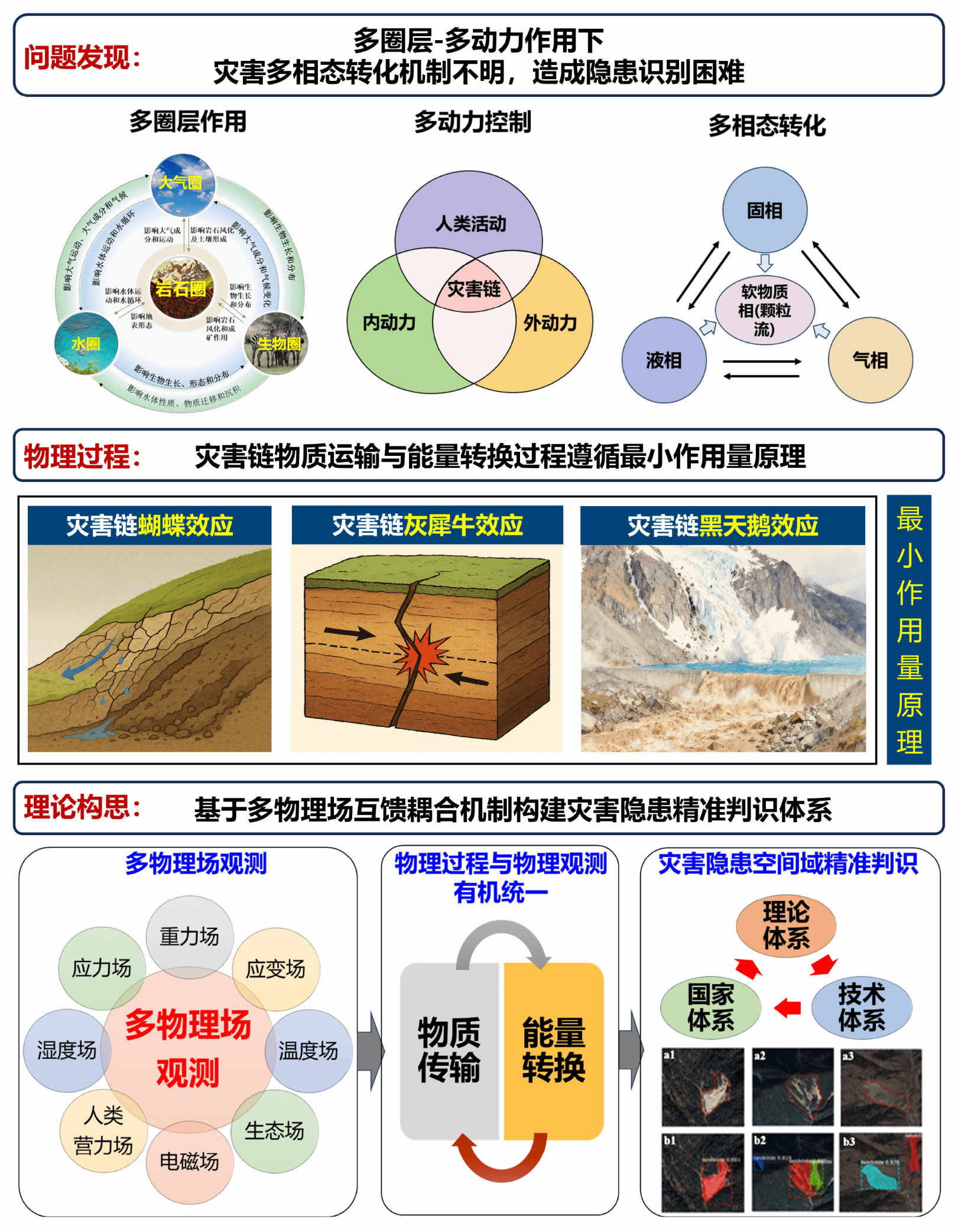 其中,隐患识别体系作为灾害精准防控的首要环节,其理论与技术突破尤为关键。我校李振洪教授团队在期刊同一专题发表的论文《复合链生重大地质灾害隐患识别理论与方法:现状与展望》为这一体系提供了前沿支撑。该团队将最小作用量原理引入复合链生重大地质灾害研究,揭示了灾害链演化中物质与能量传递的“最优路径”,并构建了“理论层面-技术层面-国家层面”三位一体的隐患识别框架。通过融合多源遥感、人工智能与地质力学,能够显著提升复合链生灾害隐患“识得全、测得准”的能力,是自然灾害整体防治体系中理论创新与技术突破协同的典范。